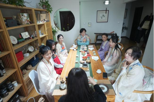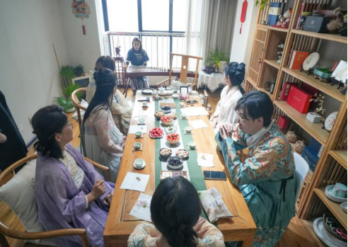 活动在“华服初妆·签到留影”中拉开帷幕。平日里专注于教学科研的女教师们,纷纷换上典雅的汉服,在沉浸式妆造体验中感受传统服饰的流转变迁。衣袂飘飘间,一曲客家筝曲《出水莲》悠然响起,古筝演奏者现场抚琴,清越的琴音为活动现场铺陈出古典雅致的底色。茶点时光里,各位教师畅所欲言、畅叙情谊,为活动增添了融融暖意。